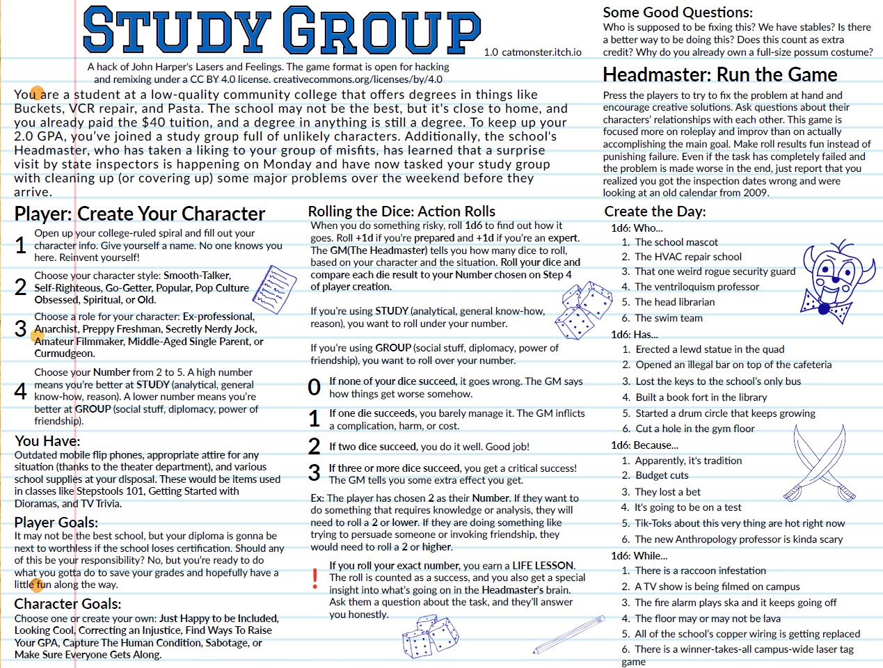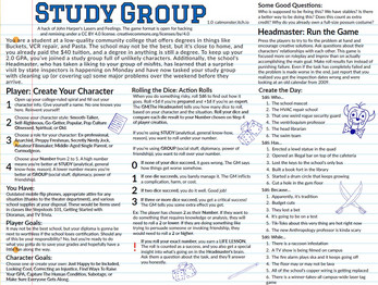 Study Group is a roleplaying game inspired by the TV show, Community. Use the power of STUDY to solve problems, or invoke the power of friendship to get things done as a GROUP.